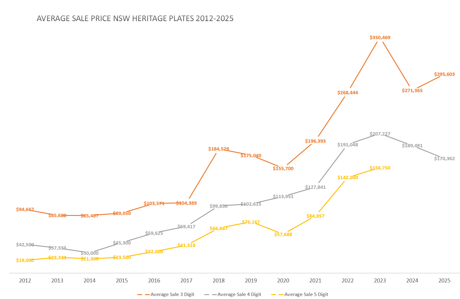 As an update from 2023, here's the end of 2025 sales for NSW Heritage car plates 3 and 4 digits. Shannons stopped doing it's auctions so the data is from Lawsons and Collecting Cars.